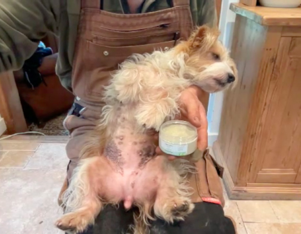 Mildred came to her current owners at age four with a severe skin condition and notable anxiety. She had previously been treated with regular tablets to suppress scratching and steroids to help heal scabs. Her coat was sparse — with no fur on her belly, legs, or chest — due to long-term irritation and previous environmental neglect. Her anxious itching behaviour appears to be habitual and may serve as self-soothing.